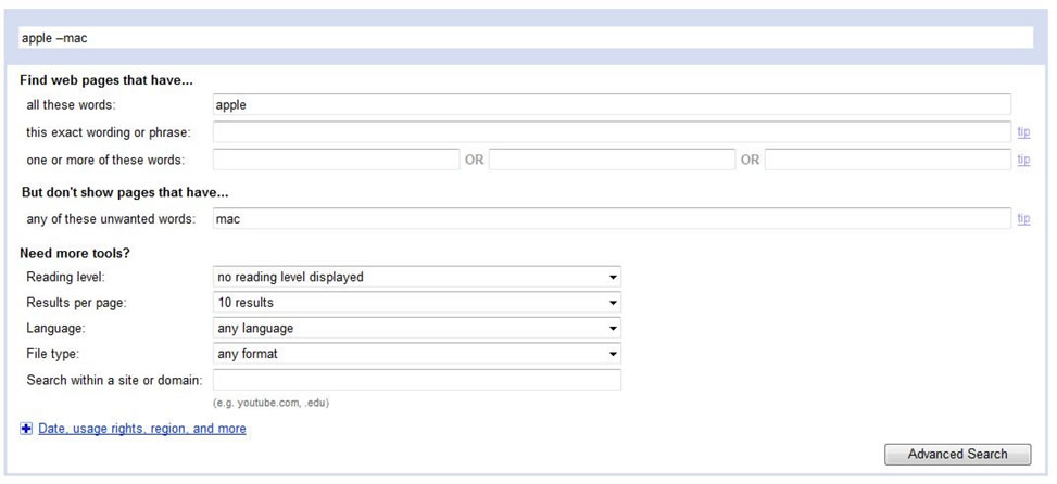 6. Go to www.google.com and navigate to the advanced search section. Type ‘apple’ in the ‘all these words:’ search field and ‘mac’ into the ‘any of these unwanted words:’ search field.